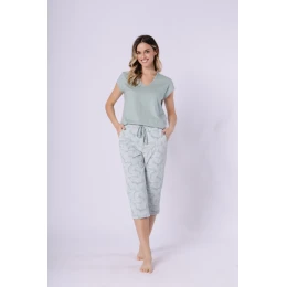 Toto elegantné dámske pyžamo spája pohodlie s funkčným dizajnom. Tričko s krátkymi rukávmi a výstrihom do V má praktické vrecká a 3/4 rukávy, čo zaručuje pohodlie a voľnosť pohybu. Nohavice s jemnou potlačou sú vyrobené z mäkkého materiálu a elastický pás a šnúrky na stiahnutie zaručujú ideálne prispôsobenie. Striedma farebnosť dodáva pyžamu klasický a uvoľnený charakter. Celá súprava je zabalená v praktickom fóliovom vrecúšku, takže pyžamo je ideálne ako darček.
