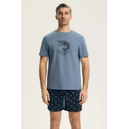 Tento pohodlný a štýlový pánsky pyžamový komplet je ideálnou voľbou na pohodlný spánok a relaxáciu v domácom prostredí. Tričko s okrúhlym výstrihom a krátkymi rukávmi poskytuje voľnosť pohybu a klasický, nadčasový vzhľad. Potlač na prednej strane dodáva celému kompletu charakter a moderný nádych. Komplet je vyrobený z mäkkej a priedušnej tkaniny, ktorá je príjemná na pokožku a zabezpečuje správnu cirkuláciu vzduchu počas celej noci. Šortky s potlačou dokonale dopĺňajú tričko a vytvárajú ucelený outfit. Žiadne vrecká zabezpečujú ľahkosť a pohodlie a široký elastický pás zaručuje dobré prispôsobenie a pohodlie pri nosení bez stlačenia. Ide o praktickú ponuku pre mužov, ktorí ocenia pohodlie a štýl aj v domácom prevedení.