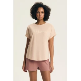 Pohodlný a stylový dámský pyžamový set je ideální volbou pro klidný spánek a relaxaci v domácím prostředí. Tričko s kulatým výstřihem a krátkým rukávem zajišťuje pohodlí při nošení a decentní nápis na přední straně dodává moderní vzhled. Střízlivá barevnost dělá set elegantním a nadčasovým. Krátké kalhoty s volným a pohodlným střihem zaručují volnost pohybu a pohodlí během celé noci. Model bez kapes udržuje lehkost a minimalistický vzhled, široký elastický pás zajistí správné přizpůsobení bez pocitu stísnění. Celý set je vyroben z měkké a prodyšné látky, příjemné k pokožce a zajišťující pohodlí při nošení. Pyžamo je baleno v praktickém fóliovém sáčku, takže se skvěle hodí i jako dárek.