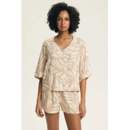 Elegantné a pohodlné dámske pyžamo je ideálnou voľbou pre ženy, ktoré ocenia pohodlie a módny vzhľad. Vrchný diel s výstrihom do V, 3/4 rukávmi a zapínaním na gombíky dodáva celej súprave mierne elegantný charakter a zaručuje pohodlie pri nosení. Strih Oversize zaručuje voľnosť pohybu a voľný, pohodlný strih. Súpravu dopĺňajú krátke nohavice, ktoré sú skvelé na teplé noci. Materiál s potlačou dodáva pyžamu výnimočný štýl a celkovo pôsobí žensky a moderne. Pyžamo je zabalené v praktickom fóliovom vrecúšku, takže sa skvele hodí aj ako darček.