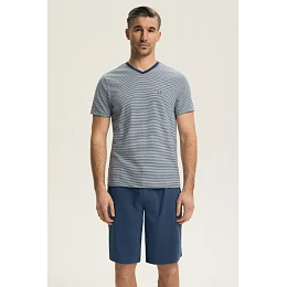 Mužské pyžamo je stylový a pohodlný set, který se skvěle hodí jak k spaní, tak k domácímu relaxaci. Moderní střih spojuje pohodlí s estetikou, zdůrazňuje postavu a poskytuje volnost pohybu. Tričko s krátkým rukávem je navrženo s výstřihem typu V, což mu dodává lehkost a více přizpůsobený charakter. Střih jemně zdůrazňuje postavu, zachovávajíce přitom pohodlí nošení každý den. K setu jsou přiloženy krátké šortky po kolena, udržované v uvolněném, pohodlném střihu. Vyrobené z měkké a prodyšné látky zajišťují dostatečnou cirkulaci vzduchu a pohodlí, zejména v teplejších dnech. Elastický pásek a nastavitelná šňůrka umožňují ideální přizpůsobení postavě. To je skvělá volba pro muže, kteří oceňují pohodlí, funkčnost a moderní vzhled.