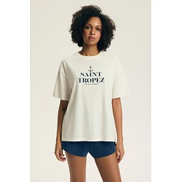 Dámsky pyžamový komplet je pohodlný a štýlový kúsok, ktorý sa skvele hodí na spanie aj ako pohodlný outfit na doma. Voľný strih poskytuje úplnú voľnosť pohybu a jemný dizajn dodáva celku ľahkosť a ženský charakter. Tričko s krátkymi rukávmi má na prednej a zadnej strane okrúhly výstrih, ktorý dodáva jemnú eleganciu a moderný vzhľad. Na prednej strane trička je módny nápis, ktorý zdôrazňuje voľný charakter kompletu. Šortky sú vyrobené v pohodlnom strihu so širokým elastickým pásom a šnúrkami v páse, ktoré umožňujú ideálne prispôsobenie postave. Celý komplet je vyrobený z mäkkej, príjemnej tkaniny, ktorá zaručuje pohodlie počas celého dňa aj noci.