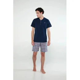 Pánske pyžamo s krátkym rukávom, zapínaním na gombíky a krátkymi nohavicami. Svieže letné farby a tenká bavlna v károvanom dizajne s oranžovými detailmi.