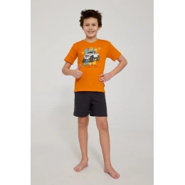 Chlapčenské pyžamo YOUNG KR 476/124 ROAD TRIP 2 je pohodlná a štýlová súprava nočného oblečenia, vytvorená s ohľadom na každodenné pohodlie vášho dieťaťa. Je vyrobené zo 100 % kvalitnej bavlny, je mäkké, priedušné a príjemné na pokožku. Tričko s krátkym rukávom zdobí atraktívna potlač na úrovni hrudníka, ktorá dodáva pyžamu moderný, mladistvý vzhľad. Súpravu dopĺňajú krátke jednotné šortky, ktoré zabezpečujú voľnosť pohybu a pohodlie počas spánku. Pyžamo je zabalené v estetickej škatuli, takže je ideálne ako darček.