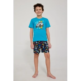 Chlapčenské pyžamo YOUNG KR 790/123 ROAD TRIP je pohodlná a štýlová súprava nočného oblečenia, ktorá je ideálna na teplejšie dni. Je vyrobené zo 100 % kvalitnej bavlny, je mäkké, priedušné a šetrné k jemnej detskej pokožke. Tričko s krátkymi rukávmi zdobí na úrovni hrudníka módna potlač, ktorá dodáva pyžamu mladistvý, dynamický charakter. Súčasťou súpravy sú krátke vzorované šortky, ktoré zabezpečujú voľnosť pohybu a pohodlný spánok. Pyžamo je zabalené v estetickej škatuli, vďaka čomu je ideálne ako darček.