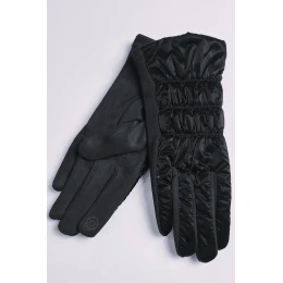 Dámske prešívané rukavice. Vrchná strana je vyrobená z lesklého ortalónu, druhá strana je z materiálu pripomínajúceho semiš a vnútri je príjemný, hrejivý fleece. Ukazovák a palec majú špeciálne prešitie, ktoré umožňuje ovládať telefón bez nutnosti sťahovania rukavice.