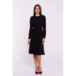 PODROBNOSTI O VÝROBKU: tkaná tkanina splývavé šaty zaoblený výstrih dlhé rukávy s manžetami na gombíky detail gombíkov opasok v páse dĺžka pod kolená bez podšívky Naša modelka je vysoká 174 cm a nosí veľkosť S navrhnuté a vyrobené v Poľsku