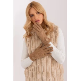 Elegantné dámske rukavice zo zateplenej tkaniny s ozdobným geometrickým vzorom. Ozdobné gombíky na zápästí s povrchovou úpravou. Ukazovateľ s vyšívaným kvetom, ktorý umožňuje ovládať telefón bez nutnosti vyzliecť si rukavice.