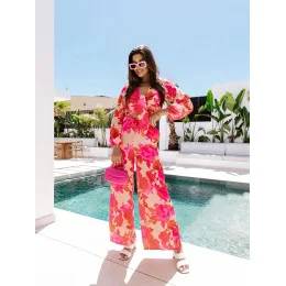 Ružovo-béžový set - blúzka na zaväzovanie a široké nohavice (8175)