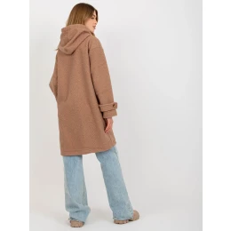 Tmavobéžový plyšový kabát so zapínaním na gombíky.