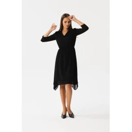 100% polyester DETAILY O PRODUKTE: tkaná šifónová látka asymetrické dvojvrstvové šaty výstrih do V elastický pás dĺžka pod kolená čiastočne podšité Naša modelka je vysoká 174 cm a nosí veľkosť S navrhnuté a vyrobené v Poľsku
