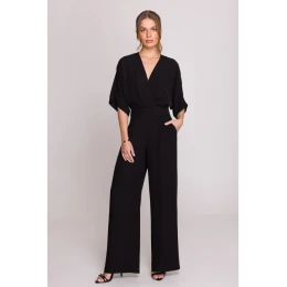 S395 Kombinéza so širokými nohavicami a zavinovacím výstrihom - čierna