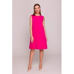 65% polyester 30% viskóza 5% elastan Podšívka: 95% polyester 5% elastan Materiál: hladká, mierne elastická tkanina so saténovým povrchom PODROBNOSTI O VÝROBE Výstrih: okrúhly, blízko krku, s kovovou ozdobou uprostred Rukávy: bez rukávov Zapínanie: skrytý zips na chrbte Vrecká: žiadne Podšívka: s podšívkou Model: S408 Navrhnutý a vyrobený v Poľsku Model je vysoký 170 cm a má na sebe veľkosť S STYLE A STRIH Strih: áčková silueta Tvar: voľný strih Dĺžka: nad kolená