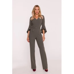63% polyester 33% viskóza 4% elastan LÁTKA Materiál: hladká tkanina s jemným povrchom PODROBNOSTI O PRODUKTE Výstrih: výstrih do V Rukávy: dĺžka 7/8, zakončené volánmi Nohavice: rovné, s nariasením Pás: zvýraznený opaskom a prackou Zapínanie: skrytý zips na chrbte Vrecká: žiadne Podšívka: žiadna Model: S416 Navrhnutý a vyrobený v Poľsku Modelka je vysoká 174 cm a nosí veľkosť S STYLE A ŠTÝL Štýl: dámsky overal s ozdobnými rukávmi Tvar: vypasovaný vrch, rovné nohavice Dĺžka: po celej dĺžke, až po zem
