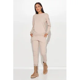 Klasická dámska súprava z tenkého bavlneného úpletu sa skvele hodí na pracovný aj každodenný styling. Sada je jednotná a jednoduchá. Jedinou ozdobou je krásna jemná nášivka s podpisom značky. Vďaka tomu je sada veľmi univerzálna. Blúzka má okrúhly výstrih a nohavice majú praktické postranné vrecká. Oblečte si tento komplet s obľúbenými topánkami na podpätku a elegantnou kabelkou a vyrazte do mesta. Dávate prednosť ležérnosti pred eleganciou? Potom si obujte športové topánky, vezmite batoh a oblečte si túto krásnu teplákovú súpravu.
