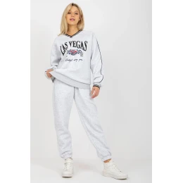 Mikinový set pozostávajúci z mikiny a nohavíc. Blúzka s dlhými rukávmi a výstrihom do V. Dlhé nohavice so zaväzovaním v páse a nápletovými vreckami.