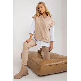 Mikinový set pozostávajúci z blúzky, mikiny a nohavíc. Blúzka s 3/4 rukávmi a okrúhlym výstrihom. Blúzka s krátkymi rukávmi a kapucňou. Dlhé nohavice so zaväzovaním v páse a nápletovými vreckami.