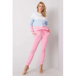 Tepláková súprava pozostávajúca z mikiny a nohavíc. Blúzka s dlhými rukávmi a okrúhlym výstrihom. Mikina z látky v troch farbách. Dlhé nohavice s pružným pásom, sťahovacou šnúrkou v páse a nakladanými vreckami.