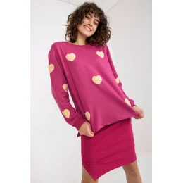 Ležérna dámska súprava pozostávajúca z blúzky a šiat. Voľná blúzka s dlhými rukávmi a okrúhlym výstrihom. Šaty vypasovaného strihu s ramienkami z rebrovanej látky.