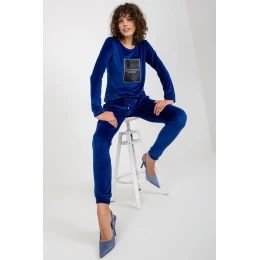 Velúrová tepláková súprava pozostávajúca z mikiny a nohavíc. Blúzka s dlhými rukávmi a ozdobným nápisom na prednej strane. Dlhé nohavice so zaväzovaním v páse a nakladanými vreckami.