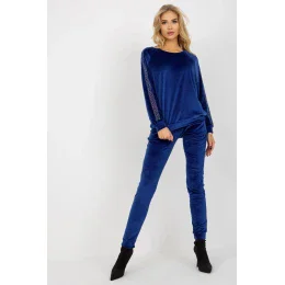 Velúrový komplet pozostávajúci z blúzky a dlhých nohavíc. Blúzka s dlhými rukávmi a okrúhlym výstrihom. Dlhé nohavice so šnúrkou v páse a vreckami na bokoch. Rukávy zdobené kamienkovým vzorom.
