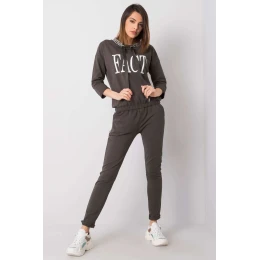 Dámska tepláková súprava pozostávajúca z mikiny a nohavíc. Blúzka s 3/4 rukávmi a malým stojačikom. Dlhé nohavice so zaväzovaním v páse a nakladanými vreckami. Ozdobný nápis na prednej strane a na golieri.