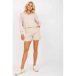 Ležérna súprava pozostávajúca zo šortiek a svetra. Voľný sveter s dlhými rukávmi. Krátke šortky s elastickým pásom a vreckami.
