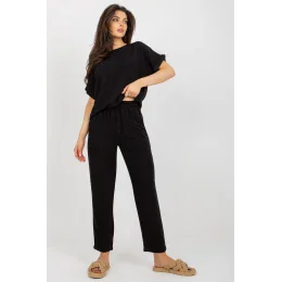 Letný komplet pozostávajúci z blúzky a nohavíc. Blúzka s krátkymi rukávmi a okrúhlym výstrihom. Dlhé nohavice s vysokým pásom, viazaním v páse a vreckami s nášivkami.