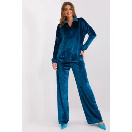 Táto velúrová súprava je dokonalou kombináciou pohodlia a štýlu. Je vyrobená z mäkkej bavlny a pri nosení poskytuje jedinečné pohodlie. Jeho hladký vzor mu dodáva všestranný charakter, takže je ideálny na každodenné nosenie, prácu aj relaxáciu. Blúzka s dlhými rukávmi má elegantný golierový výstrih, ktorý dodáva súboru jemnú eleganciu. Široké nohavice s vysokým pásom sú nielen módnym akcentom, ale aj zárukou pohodlia a atraktívneho vzhľadu. Praktické bočné vrecká dodávajú súprave funkčnosť a robia ju rovnako praktickou ako štýlovou. Dĺžka nohavíc je ideálna na nosenie v interiéri alebo vonku. Je to ideálna voľba pre ženy, ktoré si cenia pohodlie a slobodu bez toho, aby sa vzdali módy.