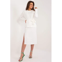 Souprava svetr a šaty je vynikající volbou pro ženy, které si cení pohodlí i stylu v každodenních situacích i při práci. Oba prvky této soupravy vypadají mimořádně působivě a vytvářejí harmonický a sladěný vzhled. Šaty bez rukávů s kulatým výstřihem vyzařují ležérnost a lehkost a dokonale ladí s každodenním stylem. Rozparky na bocích ve spodní části šatů jim dodávají trochu nonšalance, přičemž zůstávají v souladu se současnými módními trendy. Svetr, který soupravu doplňuje, má dlouhé rukávy, takže je ideální volbou pro chladnější dny. Pásek připevněný ke svetru je elegantním detailem a zároveň spojuje oba kousky v jeden celek. Dominantním vzorem je hladký povrch, díky čemuž je souprava univerzální a snadno kombinovatelná s dalšími kousky ve vašem šatníku. Díky ležérnímu stylu je tato souprava skvělou volbou pro různé příležitosti, ať už do práce, na neformální procházky nebo na setkání s přáteli. Tento