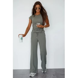 Súprava doplnená viskózou s prídavkom elastanu je ideálnou voľbou na každý deň a uvoľnené príležitosti. Súprava obsahuje tričko s krátkymi rukávmi a klasickým okrúhlym výstrihom, ktorý jemne zvýrazňuje siluetu a zaručuje pohodlné nosenie. Súpravu dopĺňajú dlhé nohavice s elastickým pásom a viazaním v páse, ktoré umožňuje ideálne prispôsobenie pásu. Na bokoch sú praktické vrecká. Vďaka ľahkému, priedušnému materiálu s prídavkom elastanu je súprava mäkká, pružná a pohodlná, skvelá na relaxáciu aj každodenné aktivity.
