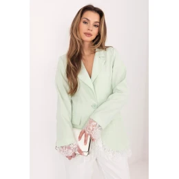 Elegantní dámský sako standardní délky navržené pro ženy, které ocení nadčasový styl a univerzálnost. Model s hladkým povrchem se skvěle hodí jak do práce, na schůzky, tak i na večírek nebo každodenní nošení. Sako má vestavěné ramenní polštáře, které jemně zdůrazňují siluetu a dodávají jí výrazný elegantní charakter. Otevírací klopy dodávají třídu a jednořadé zapínání na knoflík zajistí pohodlí a estetické přizpůsobení. Imitace kapes pod patkou zdůrazňují formální styl modelu, zachovávajíce přitom jeho lehkost. Dlouhý rukáv a spodní lem saka byly pečlivě opatřeny jemnou krajkou, která přidává ženský a originální akcent. Model má podšívku, co zvyšuje pohodlí nošení a zajišťuje, že sako se skvěle přizpůsobí postavě. Vyrobeno z vysoce kvalitní směsi polyesteru s přídavkem elastanu, zaručuje trvanlivost, pružnost a volnost pohybu. Ideální volba pro ženy, které hledají elegantní a zároveň univerzální sa