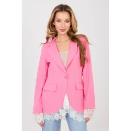 Elegantní dámský sako standardní délky, navržené pro ženy, které ocení nadčasový styl a univerzálnost. Model s hladkým zpracováním se skvěle hodí jak do práce, na schůzky, tak i na večírek nebo každodenní nošení. Sako má všité náplasti na ramenou, které jemně zdůrazňují siluetu a dodávají jí výrazný, elegantní charakter. Opatřené klopami přidávají eleganci, a jednořadé zapínání na knoflík zajišťuje pohodlí a estetické přizpůsobení. Imitace kapes pod překlapkami zdůrazňují formální styl modelu a zachovávají jeho lehkost. Dlouhý rukáv a spodní lem saka jsou pečlivě obšity jemnou krajkou, která přidává ženský a originální akcent. Model má podšívku, co zvyšuje pohodlí nošení a zajišťuje, že sako se skvěle přizpůsobí postavě. Vyrobeno z vysoce kvalitní směsi polyesteru s přídavkem elastanu, zaručuje trvanlivost, pružnost a volnost pohybů. Ideální volba pro ženy, které hledají elegantní a zároveň univerzá