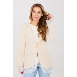 Elegantní dámský sako standardní délky navržené pro ženy, které oceňují nadčasový styl a univerzálnost. Model s hladkým zakončením se skvěle hodí jak do práce, na schůzky, tak i na večírek nebo běžný den. Sako má vycpávky na ramenech, které jemně zdůrazňují siluetu a dodávají jí výrazný, elegantní charakter. Otevřené límce dodávají třídu a jednoduché zapínání na knoflík zajišťuje pohodlí a estetické přizpůsobení. Imitace kapes pod patkami zdůrazňují formální styl modelu, zachovávajíce však jeho lehkost. Dlouhý rukáv a spodní okraj saka jsou pečlivě obšity jemnou krajkou, která přidává ženský a originální akcent. Model má podšívkou, co zvyšuje pohodlí nošení a zajišťuje, že sako se perfektně přizpůsobí postavě. Vyrobený z vysoce kvalitní směsi polyesteru s přídavkem elastanu, zaručuje odolnost, pružnost a volnost pohybu. Ideální volba pro ženy, které hledají elegantní a zároveň univerzální sako na mn
