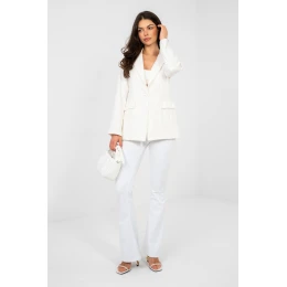 Elegantní dámský sako s nadčasovým a elegantním charakterem. Hladký vzor činí model univerzálním a snadno kombinovatelným, skvěle ladí jak s elegantními kalhotami, sukní, tak i s džínami ve více každodenním provedení. Model standardní délky s dlouhým rukávem, zapínací jednou řadou knoflíků, krásně zdůrazňuje postavu. Vsazené polštářky na ramenou dodávají konstrukci výraznosti a jemně modelují linii ramen, celkově přidávají profesionální charakter. Sako má podšívku, díky čemuž se pohodlně nosí a je pohodlné. Dole je zdobeno přišitou krajkou, která přidává ženský, jemný akcent a vyzdvihuje model mezi klasickými střihy. Vyrobeno z odolné a elastické směsi polyesteru s přídavkem elastanu, poskytuje pohodlí a volnost pohybu. Ideální volba pro ženy, které hledají elegantní sako s decentním, dekorativním detailem.