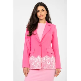 Elegantní dámský sako s nadčasovým a elegantním charakterem. Hladký vzor činí model univerzálním a snadno stylizovatelným, skvěle se hodí jak k elegantním kalhotám, sukni, tak i k džínům ve více každodenním provedení. Model s standardní délkou, s dlouhým rukávem, se zapínáním na jeden knoflík, krásně zdůrazňuje postavu. Vložené polštářky na ramenou dodávají konstrukci výraznosti a jemně tvarují linii ramen, přidávají celkovému vzhledu profesionální charakter. Sako má podšívku, díky které se pohodlně nosí a je pohodlné na nošení. Dole je dokončeno přišitou ozdobnou krajkou, která přidává ženský, jemný akcent a odlišuje model od klasických střihů. Vyrobeno z odolné a pružné směsi polyesteru s přídavkem elastanu, zajišťuje pohodlí a volnost pohybu. Ideální volba pro ženy, které hledají elegantní sako s decentním, dekorativním detailem.