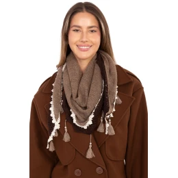 Elegantný a ženský trojuholníkový šál s rôznou štruktúrou materiálov, vyrobený z mäkkej viskózy, ktorá je príjemná na dotyk a ľahká. Model s dĺžkou 52 cm a šírkou 152 cm sa skvele nosí na ramenách a dodá štýl každému outfitu. Šál je zdobený čipkovanými detailmi a retiazkami s perlami, ktoré mu dodávajú jemný, romantický charakter. Je ideálny na každodenné nosenie aj výnimočné príležitosti, bude krásnym doplnkom elegantného kabátu aj ležérneho saka.