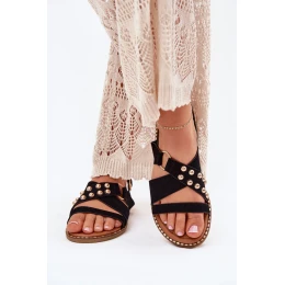 Dámske sandále z ekokože sú štýlovou ponukou na teplé dni. Plochý podpätok poskytuje pohodlie pri každom kroku a ozdobné zlaté cvočky im dodávajú výnimočný charakter. Zapínanie na pracku s nastaviteľným remienkom sa dokonale prispôsobí chodidlu, čím zaručuje bezpečnosť a stabilitu pri chôdzi. Skvele sa hodia na denné štylizácie, ako aj na elegantnejšie príležitosti, v letných outfitoch dokonale ladia so šatami, sukňami alebo nohavicami.