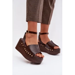 Elegantné dámske sandále z ekokože sú kombináciou pohodlia a výrazného vzhľadu. Model umiestnený na platforme spojenej s klinom poskytuje stabilitu a pohodlie pri nosení a zároveň jemne zvýrazňuje postavu. Zapínanie na remienok okolo členka zaručuje dobré nosenie a stabilitu, zlaté cvočky umiestnené po stranách dodávajú celku módny a efektný charakter. Tieto sandále sú ideálne na letnú štylizáciu.