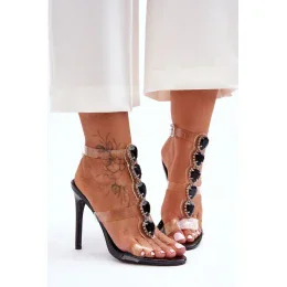 Tieto nevšedné sandále by nemali chýbať vo vašom šatníku! Majú plastový zvršok. Zdobia ich elegantné kamienky a zirkóny s imitáciou kamienkov. Vďaka stielke z prírodnej kože sa topánky pohodlne nosia. Sandále sú osadené na ihličkovom podpätku.