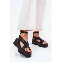 Sandały Damskie Na Platformie I Koturnie Eko Skórzane Czarne Tenzorus