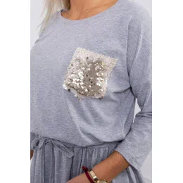 Vrecko pokryté flitrami. Šaty majú v páse viazačku.