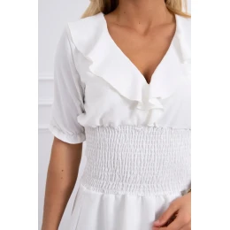Predstavujeme vám módne šaty. Šaty do pása s výstrihom do V a volánikmi. Šaty sú vyrobené z vysoko kvalitného materiálu. Ideálne na letné dni. Veľkosť je univerzálna a vyhovuje dámam, ktoré nosia veľkosť S, M alebo L.