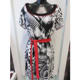 Elegantné šaty s krátkymi rukávmi , okrúhlym výstrihom a rukávmi zdobenými červeným lemovaním. Strih je mierne do pása s červeným opaskom na zaväzovanie. materiál 94 % viskóza a 6 % elastan.