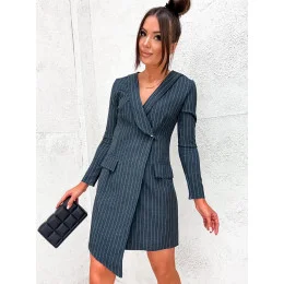 Šaty majú véčkový výstrih s klopami, dlhé rukávy, záložku a gombíky. Model má mini dĺžku. Spodná časť šiat je asymetrická.