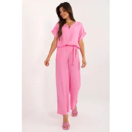 Tento ležérny komplet pozostávajúci z blúzky a nohavíc je ideálnou voľbou na každodenné nosenie a do práce. Je vyrobený prevažne z viskózy a poskytuje pohodlie a priedušnosť počas celého dňa. Hladký materiál v jednofarebnom vyhotovení dodáva kompletu elegantný, ale zároveň ležérny vzhľad. Blúzka s krátkymi rukávmi a okrúhlym výstrihom sa dobre kombinuje s dlhými nohavicami so širokými nohavicami. Nohavice s vysokým pásom zvýrazňujú pás a opasok na zaväzovanie dodáva štýlový nádych. Praktické bočné vrecká s nášivkami dodávajú kompletu funkčnosť. Ide o univerzálny komplet, ktorý sa skvele hodí do kancelárie aj na každodenné nosenie.
