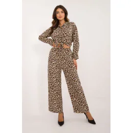 Dámska súprava s módnym zvieracím motívom, ktorá pozostáva z košele a nohavíc, vyrobená z kombinácie polyesteru a elastanu. Košeľa má dlhé rukávy a zapína sa na gombíky, čo jej dodáva klasický charakter. Okrem toho je vybavená golierom, ktorý podčiarkuje elegantný vzhľad. Nohavice sú dlhé, so širokými nohavicami, ktoré zabezpečujú pohodlie a voľnosť pohybu. Vysoký pás nohavíc krásne zvýrazňuje siluetu a dodáva celku sofistikovaný vzhľad. Táto súprava je ideálnou voľbou pre ženy, ktoré ocenia módu, pohodlie a trochu dravého štýlu na každý deň.
