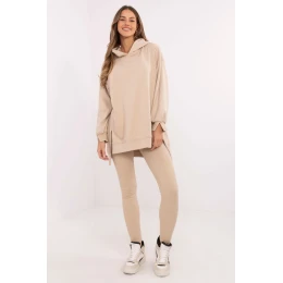 Dámský komplet skládající se z dlouhé mikiny a legín je ideální volbou pro ženy, které ocení pohodlí a styl ve svých každodenních outfitcích. Udržovaný v casualovém stylu, bude skvělý na procházku, nákupy nebo relaxaci v domácím útulku. Mikina má prodloužený zádový díl, který jí dodává moderní vzhled a zajišťuje další pohodlí při nošení. Vyrobená z směsi bavlny a polyesteru nabízí příjemný dotek a odolnost. S kapucí a dlouhým rukávem skvěle chrání před chladem v chladnějších dnech. Legíny se zúženými nohavicemi a vysokým pasem zdůrazňují postavu a zároveň zajistí volnost pohybu. Vyrobené z bavlny s přídavkem elastanu se ideálně přizpůsobí tělu. Další výhodou je pruhovaný materiál, který jim dodává charakter a odlišuje je od ostatních modelů. Celkový vzhled je udržován v jednobarevném, hladkém vzoru, což umožňuje snadné sladění doplňků a vytvoření souvislého, každodenního looku. Složení materiál