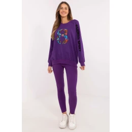 Dámský komplet skládající se z mikiny a legín je skvělým návrhem na každodenní, ležérní styling. Ideální pro ženy, které ocení pohodlí a zároveň chtějí vypadat módně a stylově. Mikina klasického střihu s kulatým výstřihem a dlouhým rukávem je vyrobena z vysoce kvalitní směsi bavlny, polyesteru a elastanu. Je příjemná na dotek, elastická a odolná, což zaručuje pohodlí po celý den. Jemné nášivky a hafty na rukávu a přední části jí dodávají jedinečný charakter a zdůrazňují moderní design. Legíny se sevřenými nohavicemi a vysokým pasem jsou ideálním doplňkem k setu. Vyrobena z bavlny s přídavkem elastanu, dokonale padnou k postavě, poskytují plnou volnost pohybu a pohodlí. Celý komplet je v hladkém vzoru, což ho činí univerzálním a snadno kombinovatelným s různými doplňky. Je to dokonalá volba na každodenní nošení, relaxaci nebo volnočasové aktivity v uvolněném stylu. Složení materiálu: Mikina: 72% bavlna, 22% poly