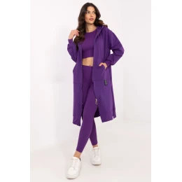 Dámský set skládající se z mikiny, topu a legín je harmonickou kombinací casual a sportovního stylu. Vytvořen s ohledem na každodenní pohodlí a aktivitu, skvěle poslouží jak při cvičení, tak při relaxaci. Mikina s prodlouženým střihem je praktickým řešením pro chladnější dny. Zapíná se na zip a je vybavena kapsami, co zajišťuje pohodlí a funkčnost. Vyrobená z směsi bavlny, polyesteru a elastanu kombinuje měkkost s pružností. Dlouhý rukáv a kapuce dále chrání před větrem a chladem. Top s kulatým výstřihem je jednoduchý a zároveň univerzální, ideálně padne ke celému setu. Jeho složení z bavlny a elastanu zaručuje prodyšnost a pohodlí nošení. Legíny s zužujícími se nohavicemi a vysokým pasem zdůrazňují postavu, zároveň zajišťují plnou volnost pohybu. Vyrobené z bavlny a elastanu jsou elastické a odolné. Dalším výrazným prvkem je proužkovaná struktura materiálu, která jim dodává unikátní charakter. Celkově drží v hladk